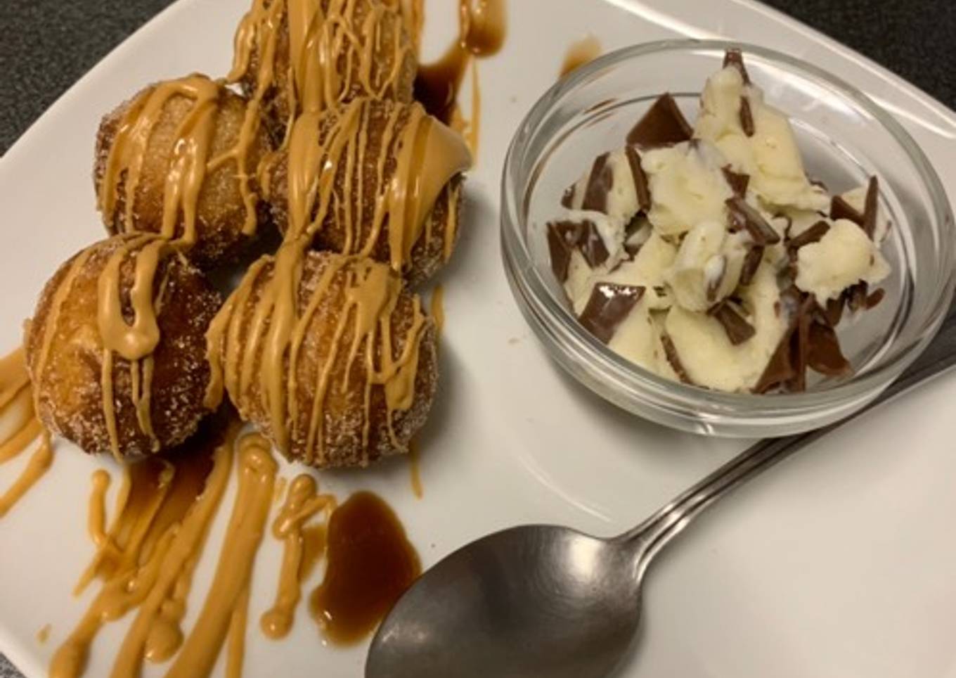 - Fry donut holes for approx 3.5 minutes. Cut one open to check if it is cooked properly. Roll in cinnamon sugar while still warm. Drizzle with caramel chocolate and serve warm with ice cream